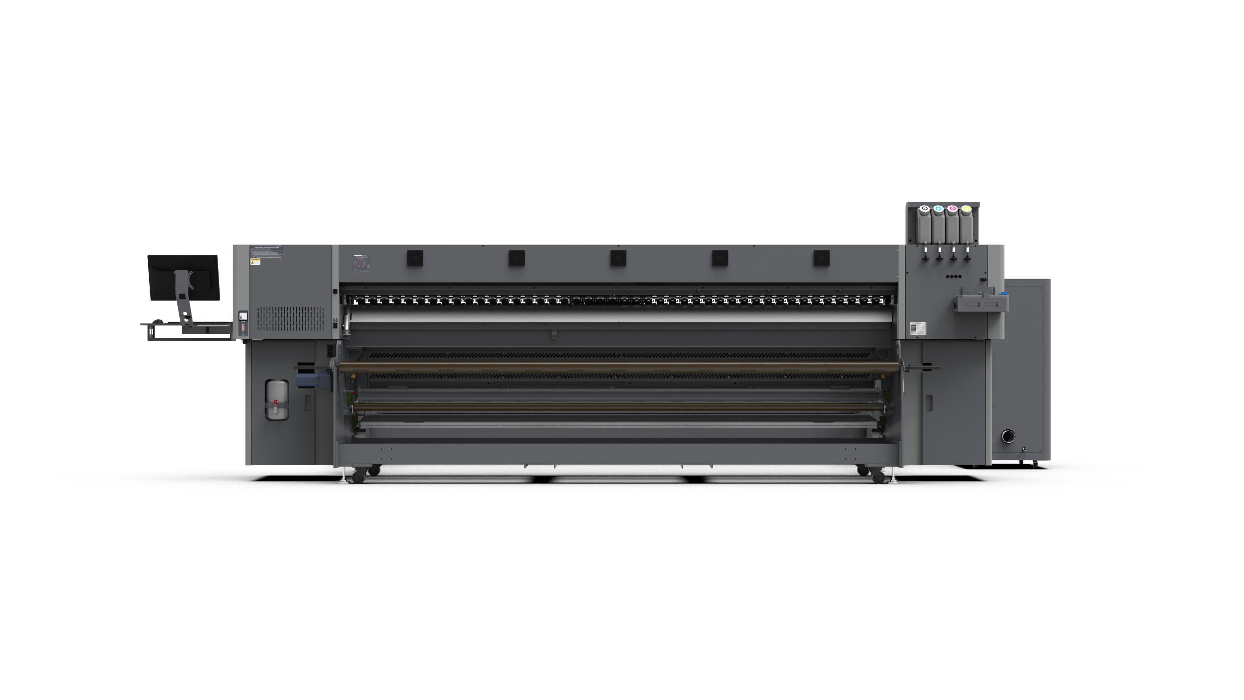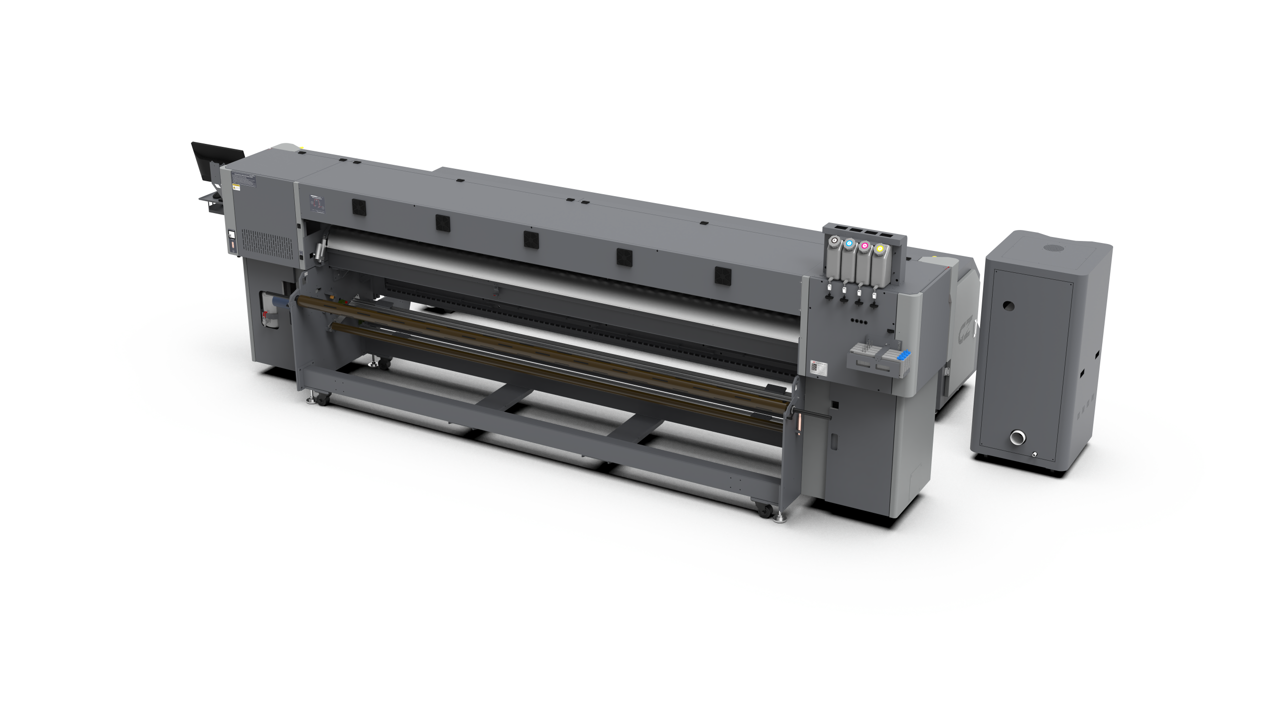 Az opcionális hőfixáló egység akár 150 méter/óra sebességű szublimációra képes, így hatékonyan támogatja a nagyobb volumenű termelést. Az anyagbefűző rendszer állítható vezetőtengellyel van ellátva, amely biztosítja, hogy a textil mindkét oldala azonos feszítéssel haladjon előre, ezzel garantálva a stabil és egyenletes feldolgozást.